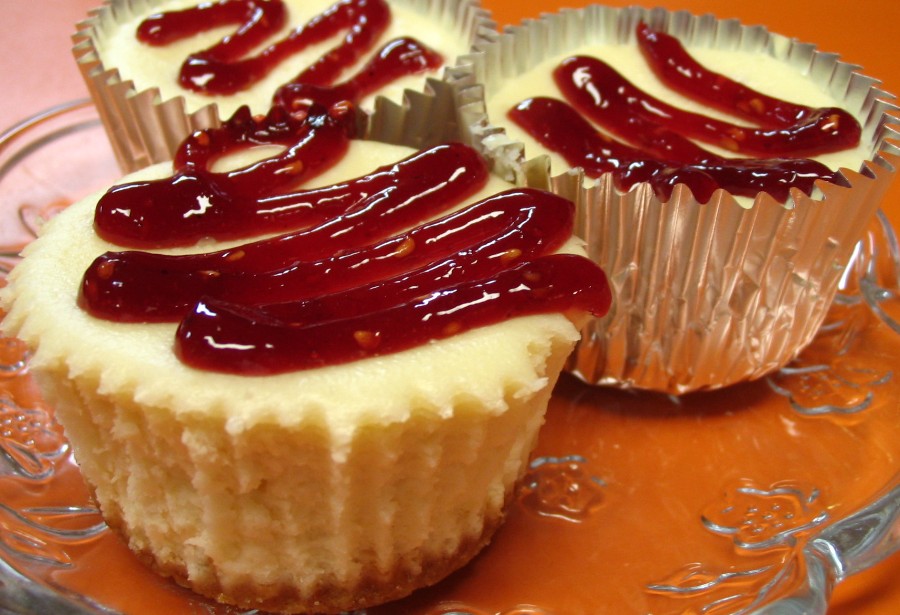Before serving, I like to add a swirl of raspberry jam on the surface of the COLD cheesecake (any jam will work, see note below).